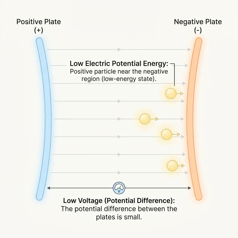 Visualize a concept of low electric potential energy and voltage. The scene takes place within an illustrated electric field, denoted with lines demonstrating electric force. Perhaps show gently glowing orbs standing in for charged particles, each one surrounded by a faint aura to represent its electric field. Include indications of electric force with arrows, smaller in magnitude to represent the low energy state. The whole scene is simple and easily understandable, geared towards illustrating these abstract physics concepts in a relatable way.
