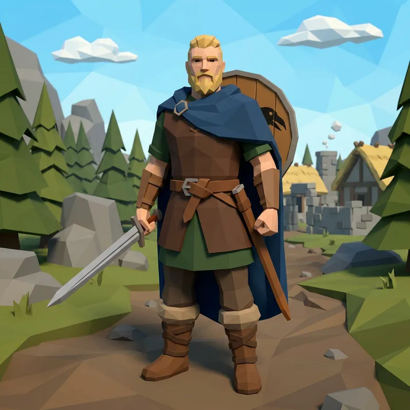 Produce a stylized image of a low-poly, full-length fantasy game character. The character is a human male with features indicative of Scandinavian heritage. His outfit and accessories should align with a high fantasy setting, thus including elements such as a leather tunic, fur boots, and a longsword. The rendering should emphasize geometrically simplistic shapes that form a cohesive and visually appealing design.