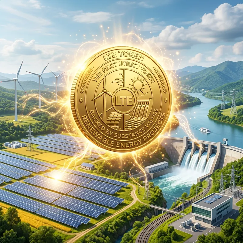 Visualise the LTE Token, symbolising the first utility token backed by substance values with projects and plants in the renewable energy sphere. This idea is heartfelt by showing the token surrounded by elements of renewable energy, such as wind turbines, solar panels, and hydroelectric power stations. The token itself should be golden and emanate a powerful light, indicating its value and importance.