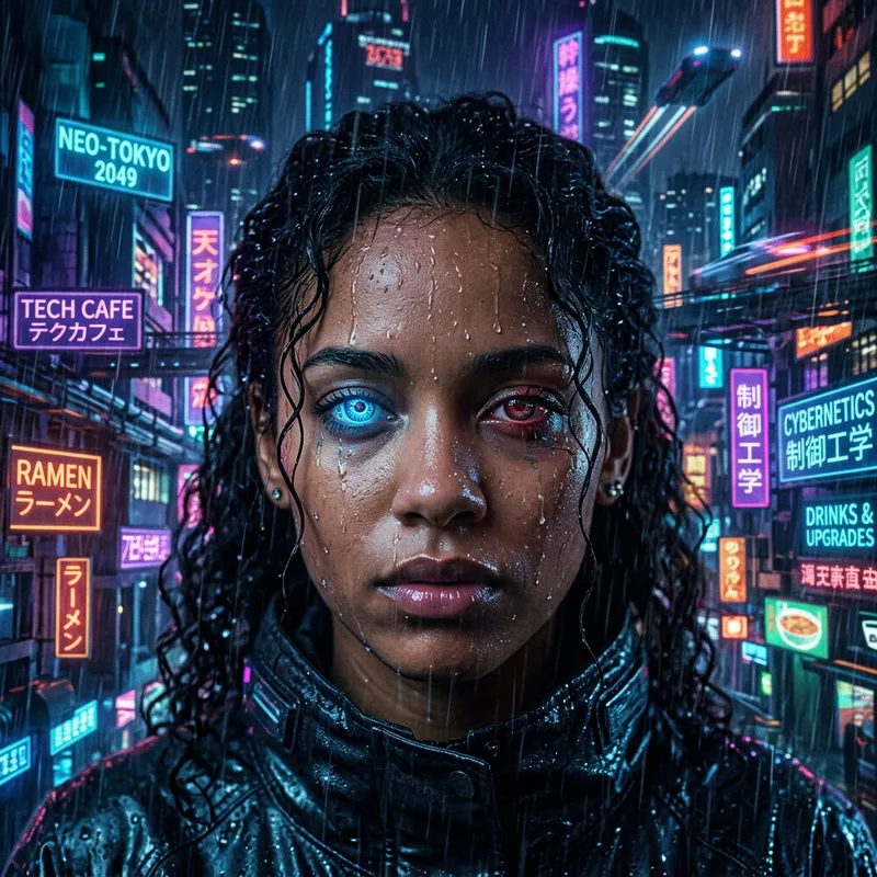Generate an intricate, luminescent cityscape portrait in a cybernetic future style. The focal point is a close-up of an Afro-Asian lady's visage amidst a rainy ambiance, with droplets cascading down her clean skin and dark hair. Her gaze is rich with emotion, one eye mirroring a dazzling cerulean luminescence while the other glows with a muted crimson, indicating subtle bionic enhancements. The backdrop is an energetic metropolis under the cover of darkness, adorned with radiant fluorescent signage in a multitude of languages and the streaks of vehicular light trails. The overall mood of the image is brooding and animated, with a color scheme dominated by various tones of azure and juxtaposing fluorescent colors.