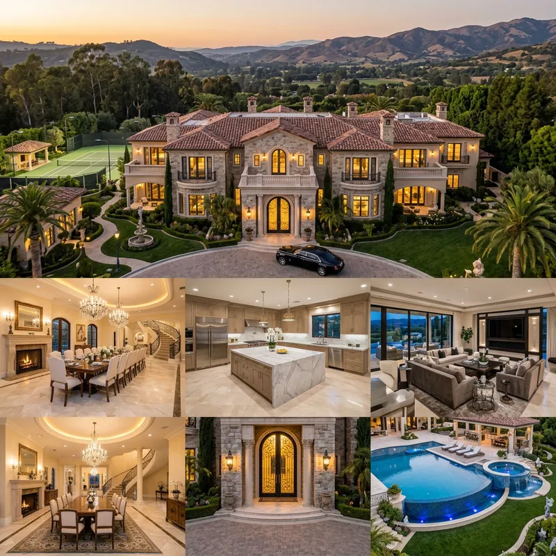 Visualize an incredibly luxurious mansion. Think about the most impressive elements you can imagine in a high-valued property. The entrance could feature large, gilded double doors, leading into an exquisitely decorated foyer with a spiral staircase. On the main level, show a grand dining room with space for hosting large gatherings, a gourmet kitchen with modern appliances, and a comfortable and stylish living area with high-tech entertainment systems. The mansion could also have numerous bedrooms and bathrooms, each with custom fittings and extravagant decoration. Outdoors, there could be a beautifully landscaped garden with an opulent pool and spa area, a tennis court, and a separate guest house.