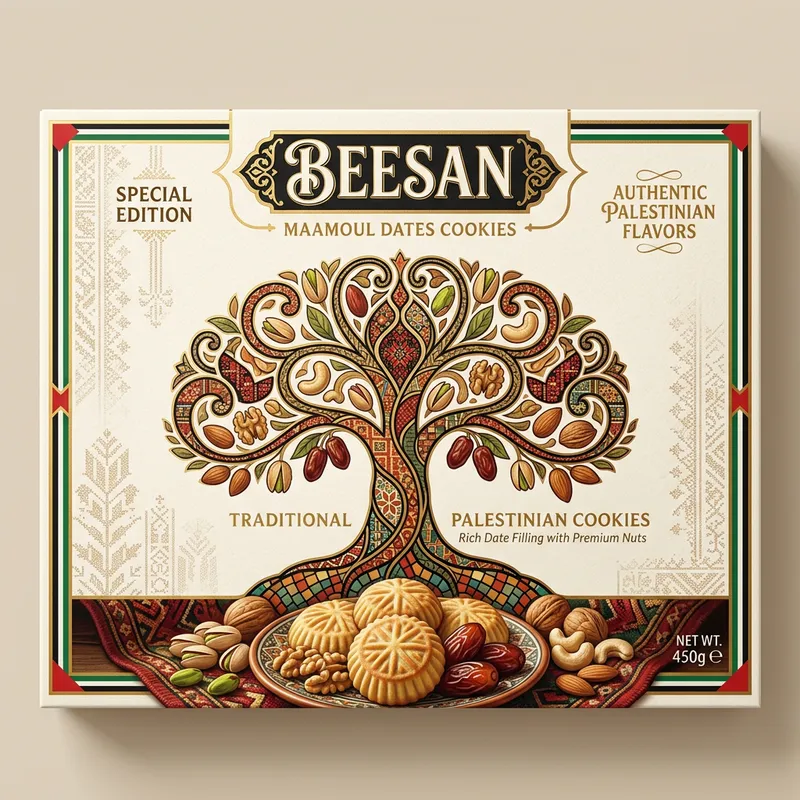 Design a captivating packaging for 'BEESAN Maamoul Dates Cookies', measuring 23 cm in width and 16 cm in height, drawing inspiration from Palestine's rich cultural heritage. The design should incorporate vibrant, warm, and earthy colors reflecting Palestinian flags colors and the natural flavors of dates, cashews, pistachios, walnuts, and almonds. The central visual element should be the intricately drawn 'Tree of Life' mosaic, utilizing contour drawing techniques. Ensure additional branding material or information can be included in the negative space. The design should feel luxurious and premium, fitting for the special edition of cookies it is meant for.