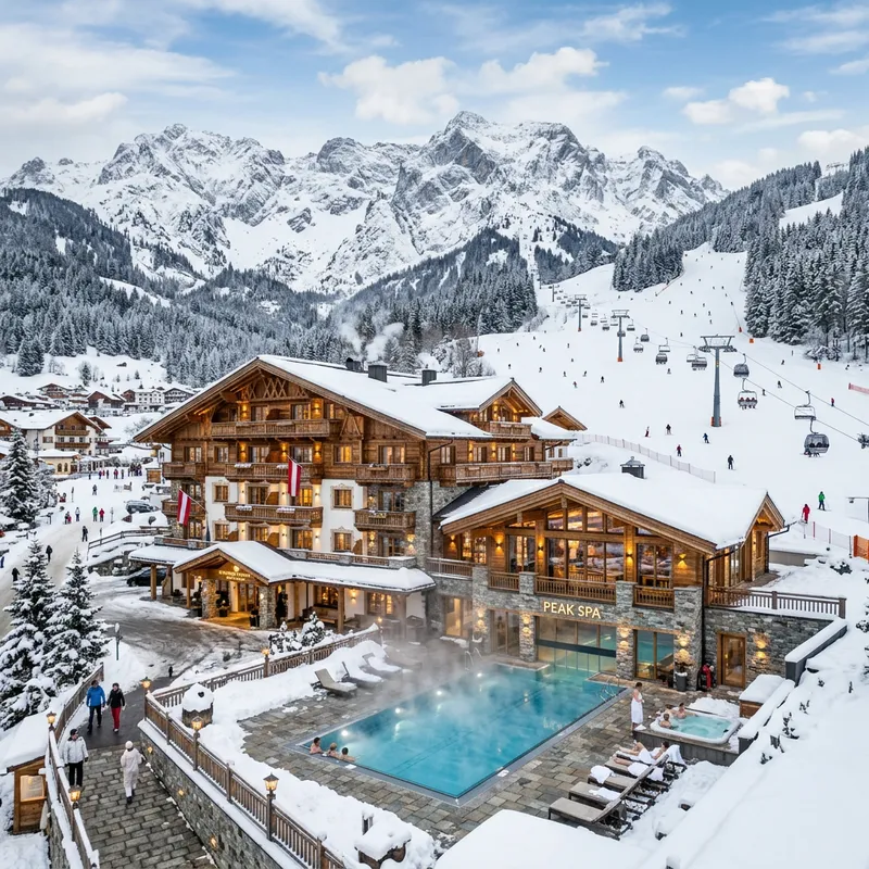 Create an image of a luxurious hotel set amongst snow-capped mountains. The architecture of the hotel should be in the style of a rustic chalet, constructed primarily from wood and stone, with sloping roofs and large, welcoming windows. Adjacent to the hotel should be a well-furnished spa complex that blends seamlessly into the overall design of the chalet. In front of the hotel, there should be an open-air swimming pool, heated and steamy amidst the chilly ambiance, offering a stark but visually appealing contrast to the snowy surroundings. The hotel should be nestled within a ski resort with ski slopes and ski lifts in the background.