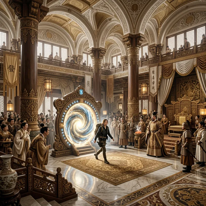 Visualize a scene of time travel set in a luxurious dynasty era. The setting should feature detailed elements that hint at immense wealth and opulence, with architectural designs and decorations, abundant in intricate details. The colors in the scene should be dominated by muted gold, white, and various shades of brown, which reflect the royal ambiance and richness of the era.