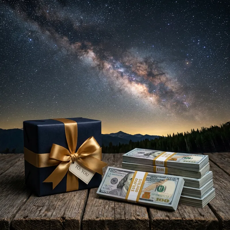 A photo of a gift box with bundles of money in front of it, all set against a starry background.
