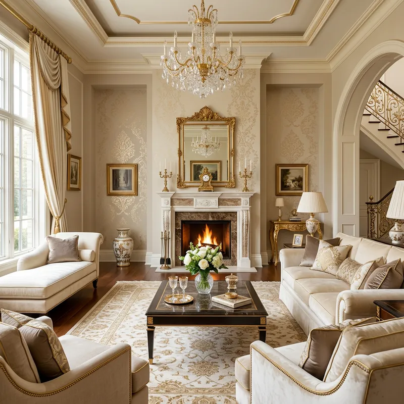 Imagine a luxurious house interior beautifully painted in an elegant color palette. The primary shades are cream and beige, which perfectly complement the muted taupe tones used for accenting certain areas of the house. Dashes of gold are used in stenciling patterns on the walls and also in the form of gorgeous, shiny golden accents highlighting the plush fabrics and intricate interior design pieces, adding an extra layer of sophistication. The overall ambiance is warm, welcoming, yet exuding opulence in every little detail.