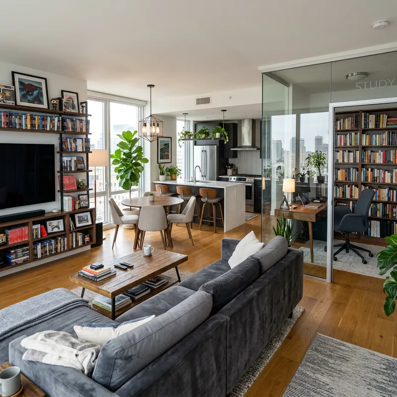 Render a photo-realistic image of the interior of a modern apartment living room. Include a well-equipped entertainment area with a luxurious couch, a sleek TV, and shelves with various movie and game collections. Adjacent to this, visualize a minimalist dining space with a table and chairs, surrounded by ambient lighting. The open-concept kitchen should have contemporary appliances, a kitchen island, and stylish bar stools. Additionally, incorporate a separate study room, accessible through a clear glass door, furnished with a desk, comfortable chair, and bookshelves brimming with diverse books along with a window to filter in natural light.