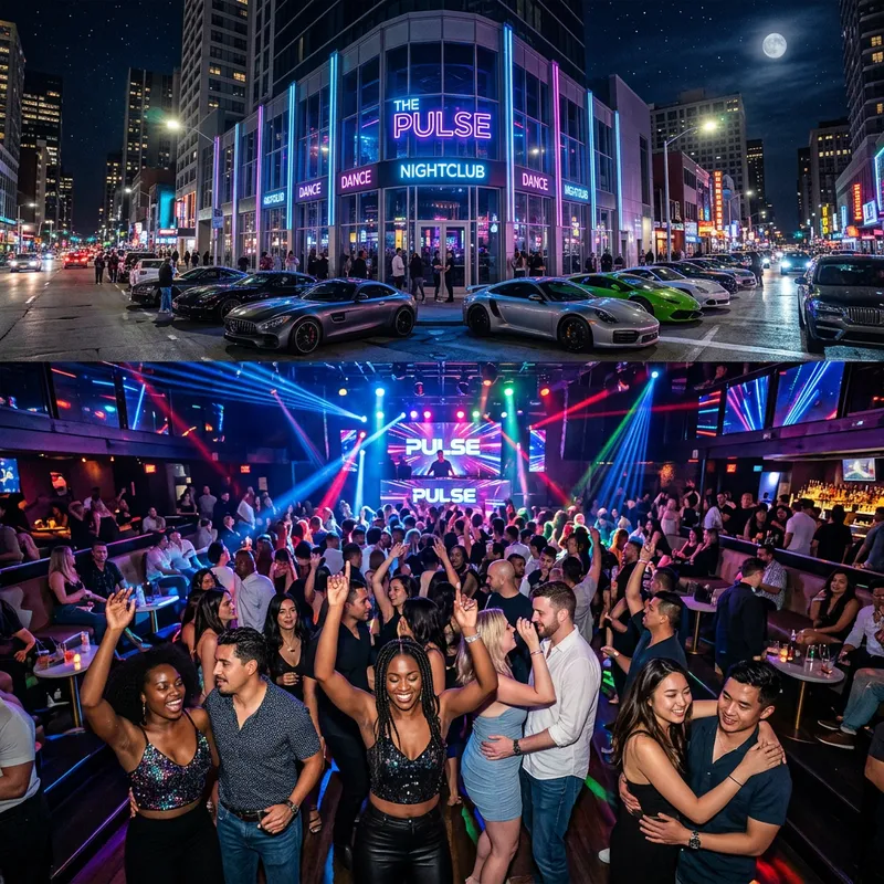 Picture a lively night club located in a bustling city. The structure exudes a classy modern design, bathed in neon lights that dance playfully off the nearby structures. Lounge chairs and tables are laid out in a welcoming manner within the club. An enthusiastic crowd, of diverse genders and descents such as Black, Hispanic, White, and Asian, grooves to the rhythm of engaging music. The ambient light within the club paints a captivating picture of fun and excitement. Outside, parked along the streets, are numerous high-end cars of various makes and models. The cars glisten under the pale moonlight, adding to the intriguing allure of the night.