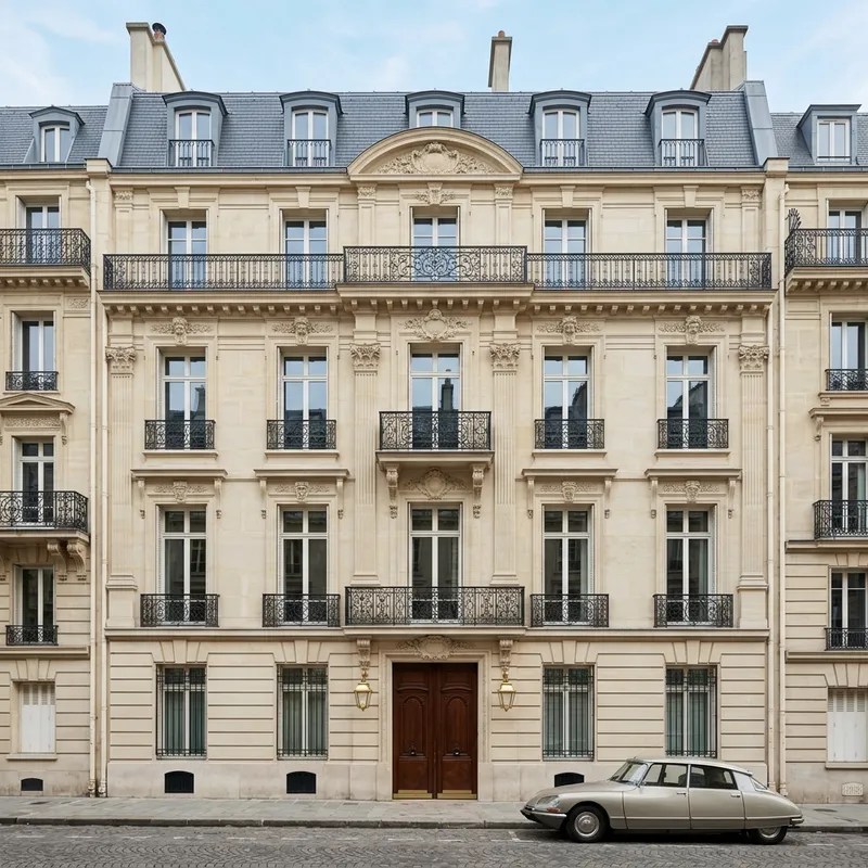 Generate an image series showcasing different aspects of a luxurious Parisian house. The first image should display the exterior facade showcasing the traditional Parisian architecture, with its characteristic features: cream-colored stone walls, ornate wrought-iron balconies, and sloping, slate-gray roofs. The second image could present a grand living room with floor-to-ceiling windows, antique furniture, chandeliers for lighting, and a spectacular view of the Paris skyline outside. The third image might depict a stylish kitchen equipped with high-end appliances, marble countertops, and vintage-style cabinetry. The last image could reveal a plush master bedroom with a king-sized bed, sumptuous linens, classic artworks on the walls, and another stunning city view.
