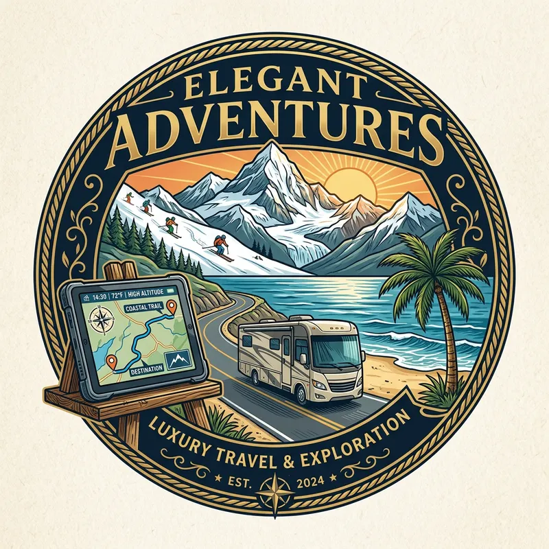 Design an elegant travel-style logo featuring various elements: a palm tree, the sea, sandy terrain, the sun, a snow-capped mountain with skiers, and a luxury motorhome departing from a road. Add in detail a digital guide showcasing a GPS map. The overall design should evoke a sense of high-end adventure and exploration.