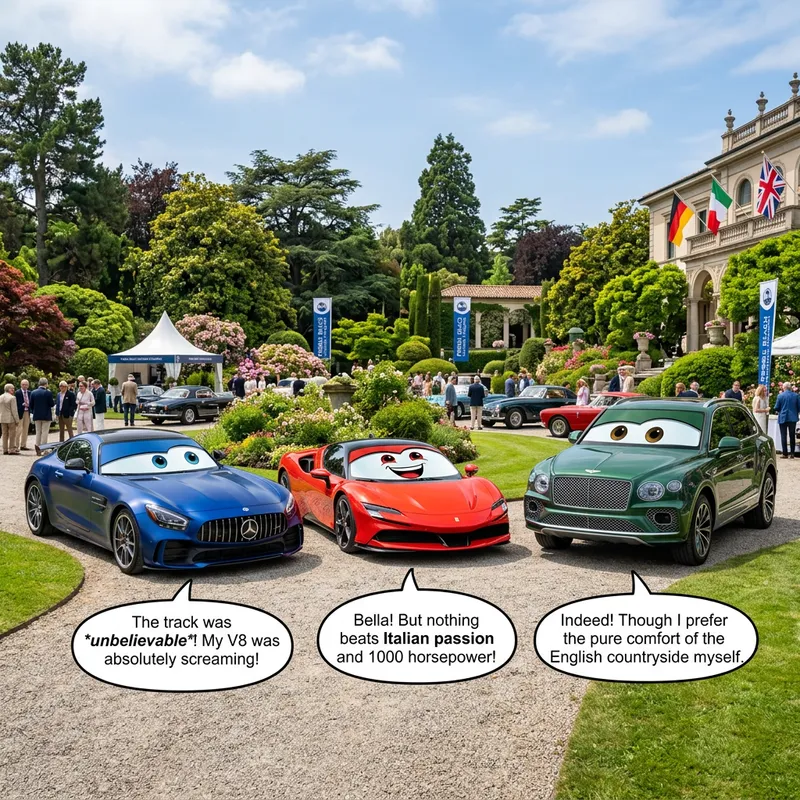 Imagine a surreal scene where three high-end luxury vehicles- a sporty German coupe, an Italian race car, and a British SUV are anthropomorphized. They have expressive cartoonish eyes and mouths on their windshields and are engaging in a conversation. The scene could be set in a lush, upscale car show or a beautiful outdoor parking lot surrounded by greenery.