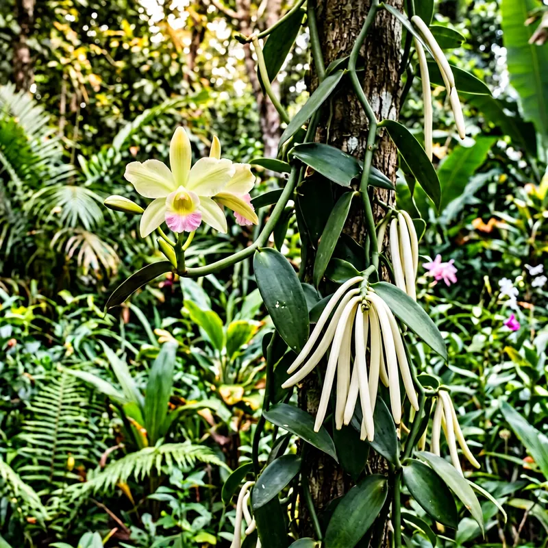 An image showcasing the vanilla from Madagascar with the orchid flower. It features a visual contrast between the lush dark orchid leafy stems and the ivory white vanilla pods clustered together along the vanilla plant. The background is a rich tapestry of the natural flora of Madagascar. The orchid flower, the plant from which vanilla is derived, is prominently featured in the foreground, with its vibrant pink and white hues standing out against the greenery.