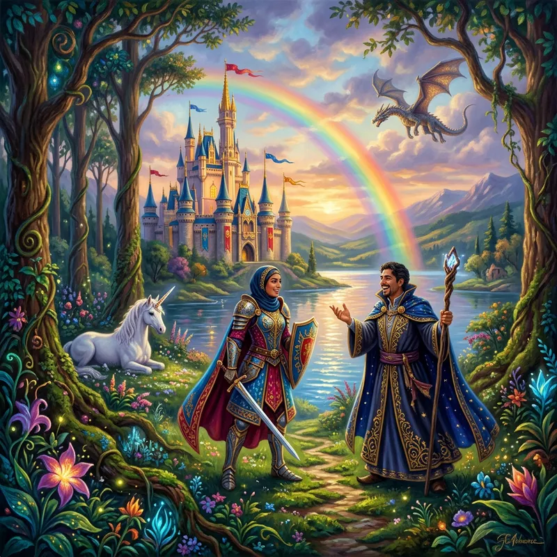 Imagine a breathtaking fairytale themed artwork, rich with magical elements. In the foreground, an enchanted forest flourishes with exotic flowers and tall, spiraling trees. At the heart of the forest, a unique castle with golden spires and fluttering flags overlooks a shimmering lake. There's a rainbow extending from the lake to the cloud-filled sky. In the scene, a Middle-Eastern female knight in her vibrant armor stands next to a Hispanic male wizard, both engaged in a lively conversation. Intricate creatures, such as a dragon and a unicorn, inhabit the surroundings. This scene captures the essence of fantastical tales, nestled in vibrant hues and delicate brush strokes, resembling paintings from the Romantic era.
