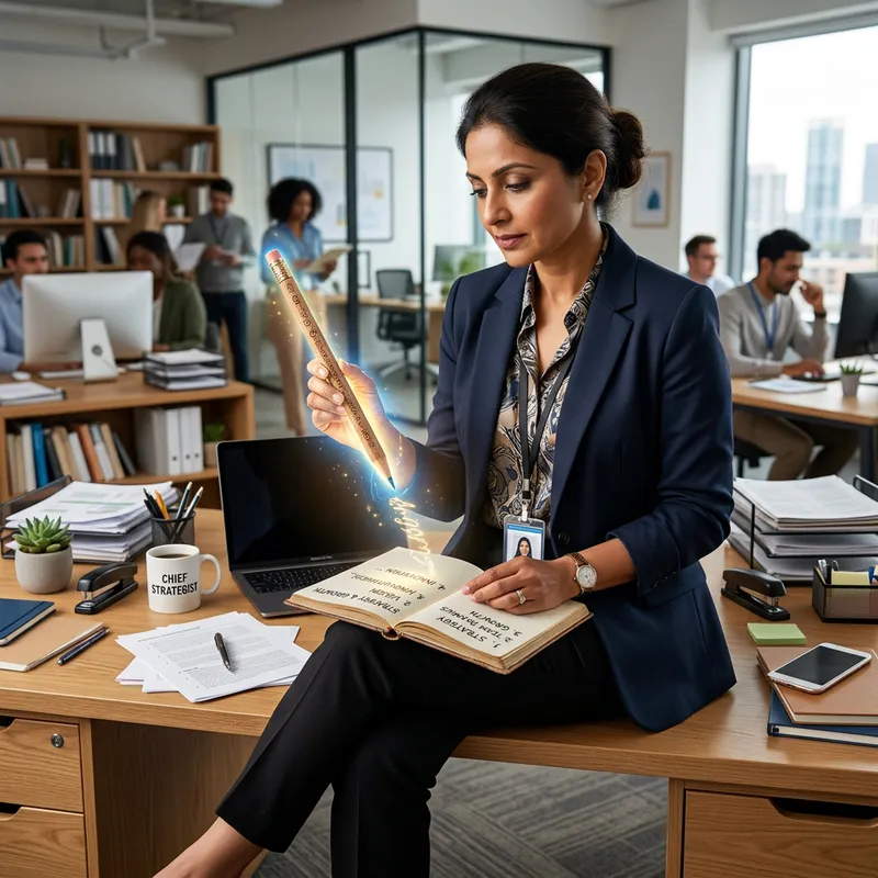 A scene showcasing a middle-aged South Asian woman, wearing business attire, placed in an office environment. She is sitting on a large wooden desk with various stationery items scattered around her. She holds a pencil in her right hand as if contemplating the next points to be listed. The pencil is unique and appears to be emanating a soft magical glow, suggesting that it has the power to manifest the holder's thoughts into reality.