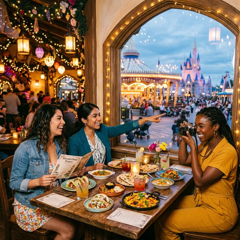 Three women at a restaurant in an amusement park that has the feel of a wonderland filled with magical, fairy-tale elements. One woman of Hispanic descent, dressed in a trendy summer outfit, is laughing, holding a menu. Second woman, South Asian descent, with professional clothes on, is pointing at something outside the window. The third woman, of Black descent, is capturing this moment with a vintage camera. They're seated at a table adorned with colorful dishes from different cuisines, under whimsical lights that twinkle like stars.