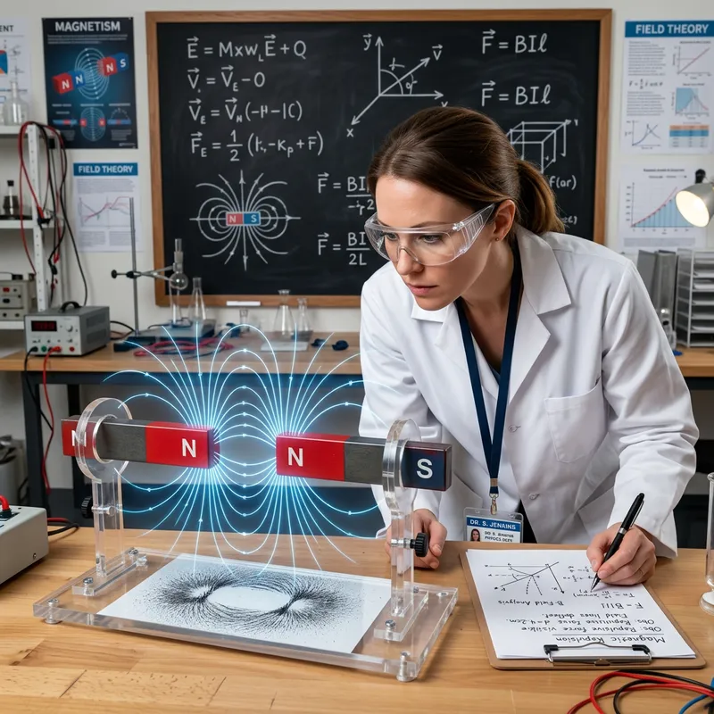 A visually striking demonstration of magnetic repulsion, with two bar magnets positioned so that their like poles are facing each other, creating a clear and visible space of repulsion between them. Outlined around them is a faint scheme representing the magnetic field lines. A scientist of Caucasian descent and female gender is analyzing this demonstration. She is peering closely at the magnets, jotting down notes on a clipboard. She wears safety goggles on her face and a white lab coat. In the background, there are scientific posters and a blackboard filled with complex equations.
