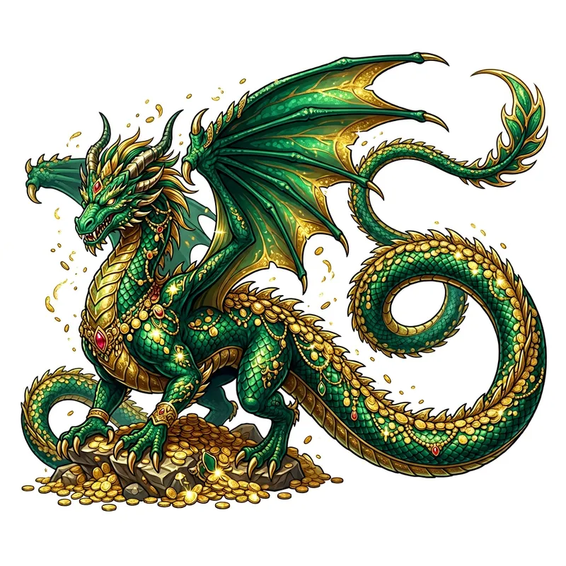 A vector illustration of a magnificent emerald-green dragon with an extraordinarily long tail. The dragon is adorned with shimmering golden coins clinging to its scales. All these elements are set against a stark white background, thus emphasizing the vibrant colors of the dragon and the glinting gold coins.