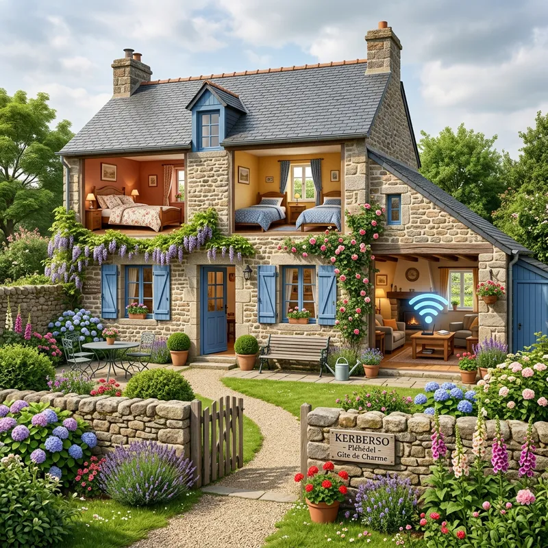 Imagine a quaint and charming house called Kerberso located in Pléhédel, near Paimpol in the Côtes d'Armor region. This welcoming holiday cottage is perfect for accommodating 2 to 4 people comfortably. Visualize it having three cozy bedrooms each decorated uniquely with comfortable beds, beautiful furnishings, and warm and inviting colors. This house is surrounded by a closed, verdant garden, teeming with a variety of flowers and plants, offering a serene outdoor relaxation space. Lastly, symbolize the modern amenities of the place by showing the glow of WiFi signal floating unobtrusively within the house.