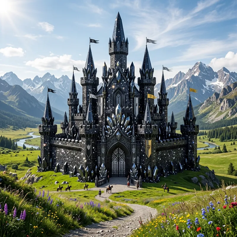 Imagine a majestic castle with towering spires and a grand entrance. It's constructed entirely out of black crystals, each one twinkling and gleaming under the sunlight. Embellishments of sequins are scattered throughout the castle, refracting the light in mesmerizing patterns and adding a touch of sparkling glamor. This stunning fortress is situated in the middle of an expansive terrain, its dramatic silhouette commanding attention against the backdrop of the distant mountain range. The ground around the castle is carpeted with vivid green grass and colorful wildflowers, creating a dramatic contrast against the dark grandeur of the castle.