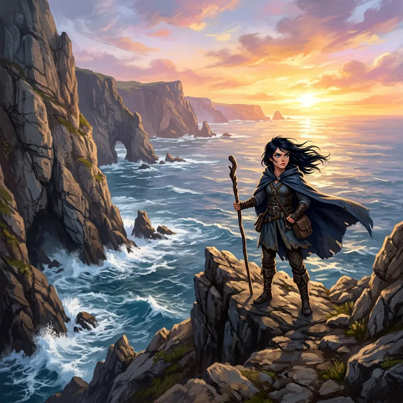 Craft an illustration of a magnificent and vast coastal landscape, marked by towering cliffs that stand guard over the restless sea. The primary scene should consist of a girl with hair as black as the abyss and eyes matching the azure grandeur of the horizon. She's stationed on a rugged rock formation, her gaze fixated on the horizon, reflecting a solid determination in her eyes. The heavens are adorned with hues of gold and pink, reflecting the enigmatic beauty that lays ahead in the anticipated pages of the story. The image should dearly capture the essence of an emerging adventure.