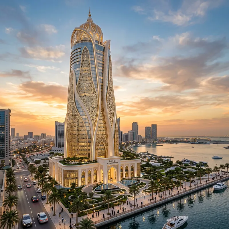 Design an architecturally realistic, fancy, eloquent, elegant, and prestigious skyscraper that features a majestic contemporary Arabian design. The skyscraper should be practical in its design and carry a feminine aesthetic. Attention to intricate detailing and Arabic motifs is essential.
