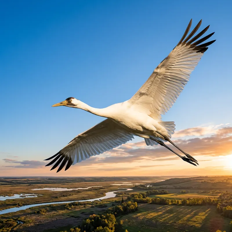A beautiful view of a clear, blue sky fills the scene. Towards the center, a majestic crane is seen in full flight, its large, white wings spread wide and gracefully. The bird's elongated neck is stretched forward, and its legs are trailing behind. Details capture the fine feather markings and the keen, intelligent gaze in its eyes. The sun is low, casting long, dappled shadows over the landscape below, and the crane is outlined just perfectly against this backdrop, highlighting its impressive size and elegance.
