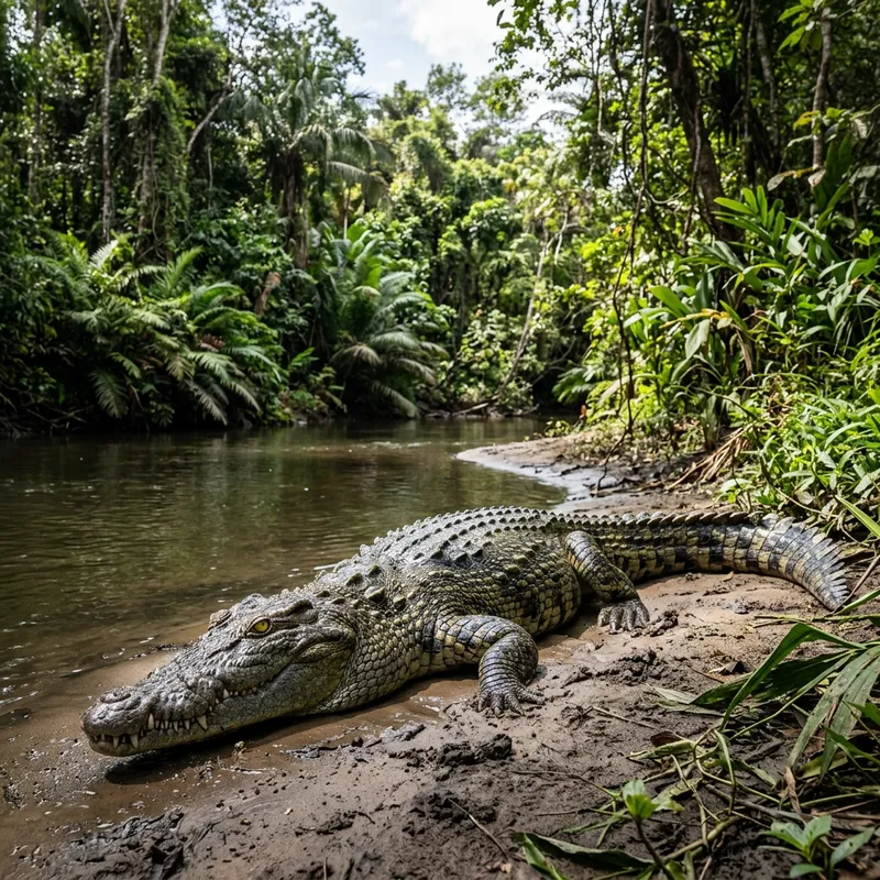 Visualize a mature crocodile resting by the river bank. Its dark green scales brilliantly reflecting the sunlight, its powerful tail sprawled out on the sand, and its yellow menacing eyes sharply focused on its surroundings. Not too far off, lush vegetation of tropical plants forms a natural backdrop, completing this serene outdoor scene in a wild jungle.