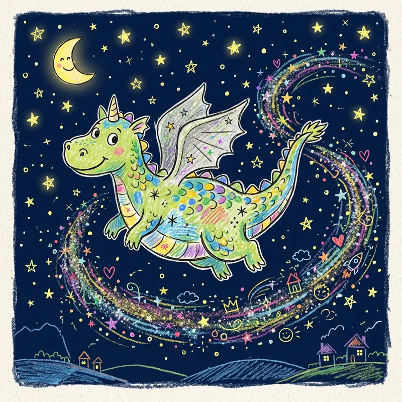 An easy sketch depicting an awe-inspiring dragon with glittering scales, flying in a nighttime sky illuminated by countless stars. The dragon leaves behind a trail of stardust, encapsulating the birth of dreams and the eminence of imagination. This delightful scene is drawn with the innocent creativity that would characterize a toddler's art.