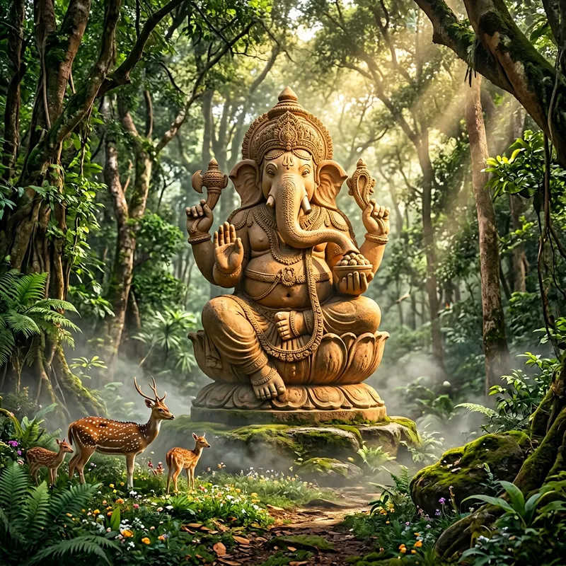 Visualize a large, majestic statue of Ganesha, the elephant-headed deity revered in Hindu mythology. The statue is situated in the middle of a serene and lush forest. The statue is skillfully carved out of sandstone, with elaborate details on it, including Ganesha's well-known attributes such as his large belly, the broken tusk, and the four hands holding his symbolic items. Rays of sunshine filter through the forest canopy, illuminating the statue and creating a spiritually calming atmosphere. Fog gently rolls around the statue, enhancing the effect of divinity. A family of deer can be seen grazing peacefully nearby.