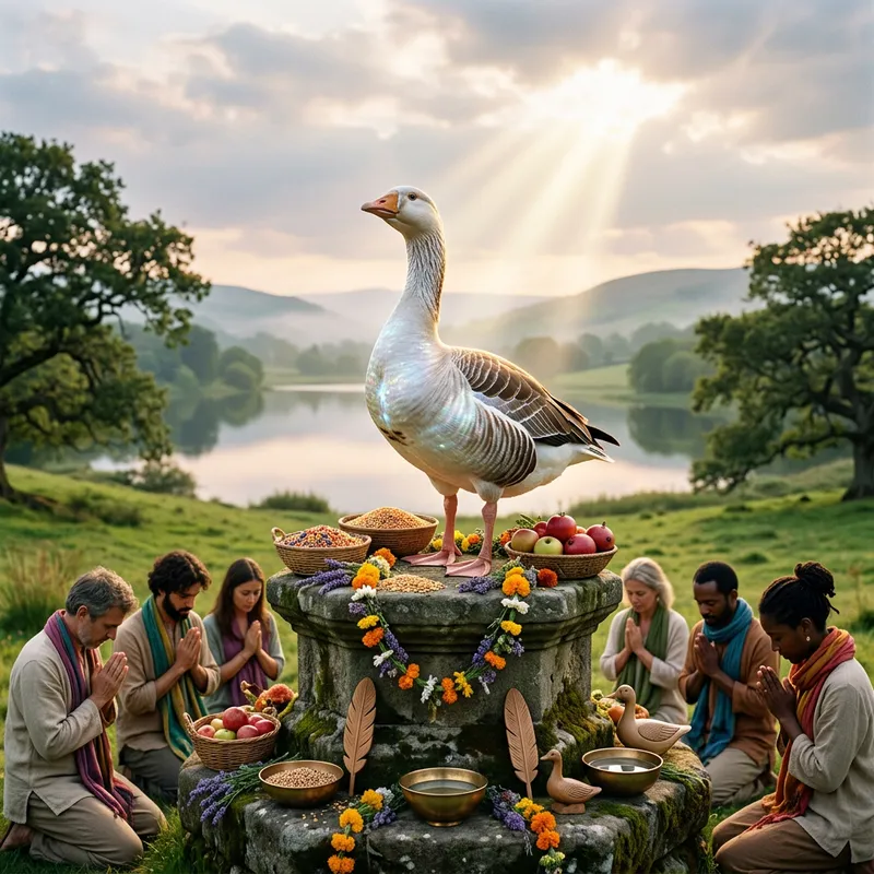 An image of a goose being revered as a deity, standing majestic and tall against a serene landscape. The goose's feathers are detailed and radiant, glinting under the celestial light that's cascading from the sky. This avian deity is surrounded by offerings, symbols of reverence, and respect from those who worship it. The atmosphere, imbued with a sense of divine sanctity, is calm and peaceful.