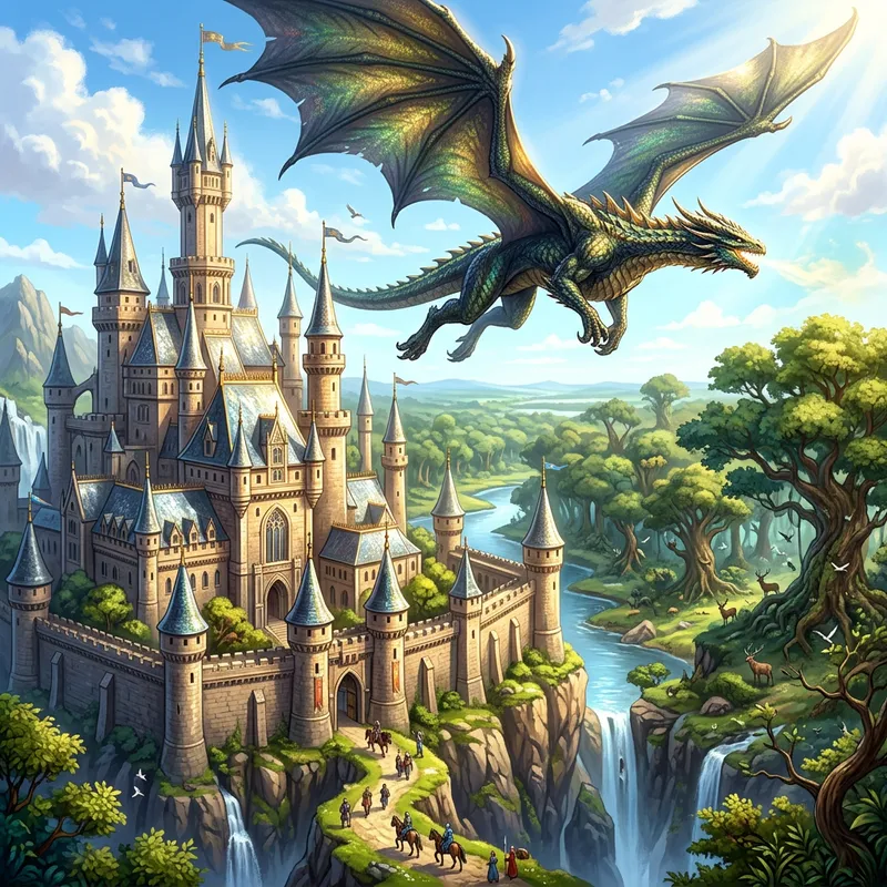 A magnificent kingdom with colossal stone structures and towering turrets. A grand castle sits as the crowning glory, its sloping rooftops glistening in the sunlight. An expansive forest brimming with lush foliage and myriad fauna lies on the outskirts, its verdant greens contrasting the stone-gray of the castle. Dominating the scene is an imposing dragon, posing in mid-flight with wings outspread and scales shimmering under the sunlight, exhibiting an allure and majestic aura. All of these rendered with the intricate and vivid detailing characteristic of fliplart style.