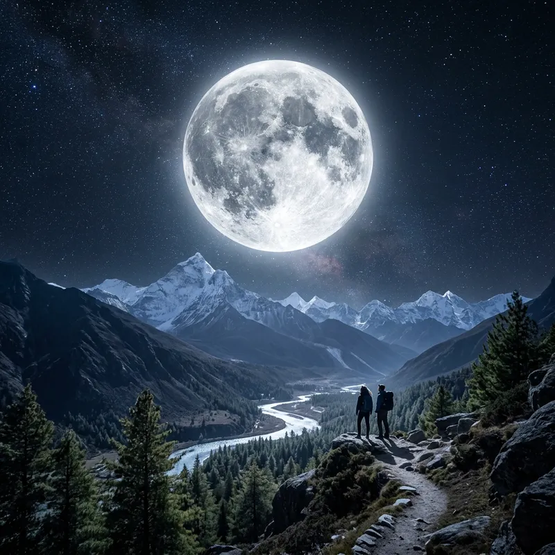 The most beautiful moon ever seen by the human eye, majestically glowing in the night sky, casting a silvery light over a serene landscape. Observed from beneath, it dominates the star-speckled firmament, bathing the world below in its ethereal luminescence. This celestial spectacle creates an ambiance of tranquility and wonder, as the moon's craters and mountains appear in stark relief, sparking imagination about the worlds beyond our earthly confines.