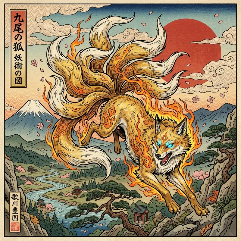 Majestic Nine-Tailed Fox Ukiyo-e Art