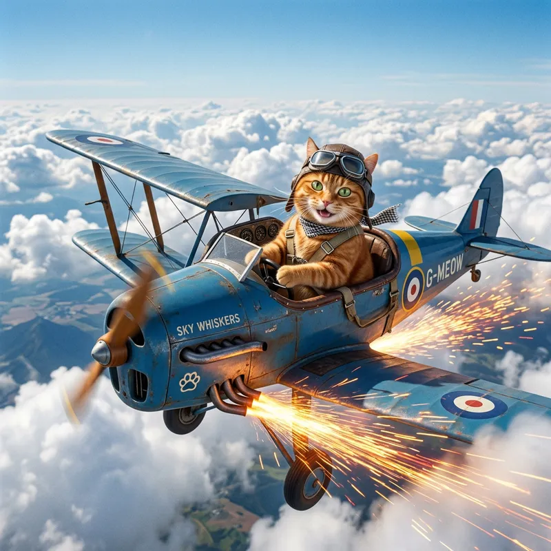 Majestic Red Cat in Blue Airplane with Sparks of Fire