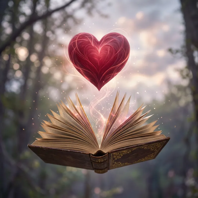 A majestic, deep red heart appears in the upper middle of the view. It appears vivacious and full of life as if it were pulsating. Directly beneath this heart, an open book is positioned, its pages fanned out and seeming to float mystically in the air. The book's positioning under the heart suggests a narrative beginning with love, spreading its magic from the heart to the entirety of the book. Both the heart and the book have a surreal quality, as though they are gracefully floating in an invisible breeze, enhancing the overall beauty of the scene.