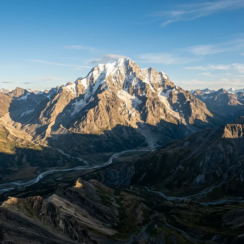 An image featuring an imposing mountain. It's bathed in sunlight, casting long shadows over the rugged terrain. The peak is snow-capped, standing majestically against the clear, blue sky. It seems untouched by human presence, a serene representation of nature's grandeur and power. Despite its daunting presence, there's a certain tranquility associated with it, embodying the quiet beauty of a solitary landscape
