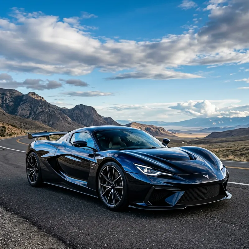 A sleek car that exudes power and elegance, much like a majestic Super Eagle, stands powerfully against an open sky. The car's aesthetic design evokes an image of a Super Eagle about to take flight. Its exterior is polished to a mirror-like shine, reflecting the eternal blue sky, and its make is sophisticated, with aerodynamic lines that blend seamlessly together. This vehicle represents the pinnacle of innovation and speed—a metaphorical Super Eagle ready to soar across the highway.