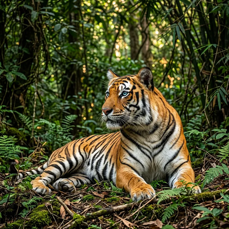 An incredibly detailed image of a majestic tiger resting in a lush forest. The tiger's coat is a vibrant mixture of orange, black, and white, with distinctive stripes decorating its body. Its piercing blue eyes are alert and intense, tracking unseen movements in the foliage. The sunlight filters through the dense green forest canopy, casting dappled light across the tiger’s muscular body and highlighting the energy and grace inherent in this powerful creature.