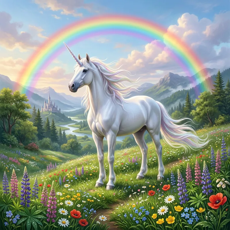 A mythical creature, a unicorn, in the middle of a vividly colored environment. The unicorn has a shiny, spiraling horn protruding from its forehead and its coat is shiny white. It's standing majestically on a verdant hill, its long mane and tail flowing in the breeze. In the distant backdrop, arches an exquisite rainbow, embellishing the clear sky with its lively colors after a brief sprinkle of rain. Flower patches speckle the hill, further beautifying the scene. The entire atmosphere feels magical and serene, like something out of a fantasy tale.