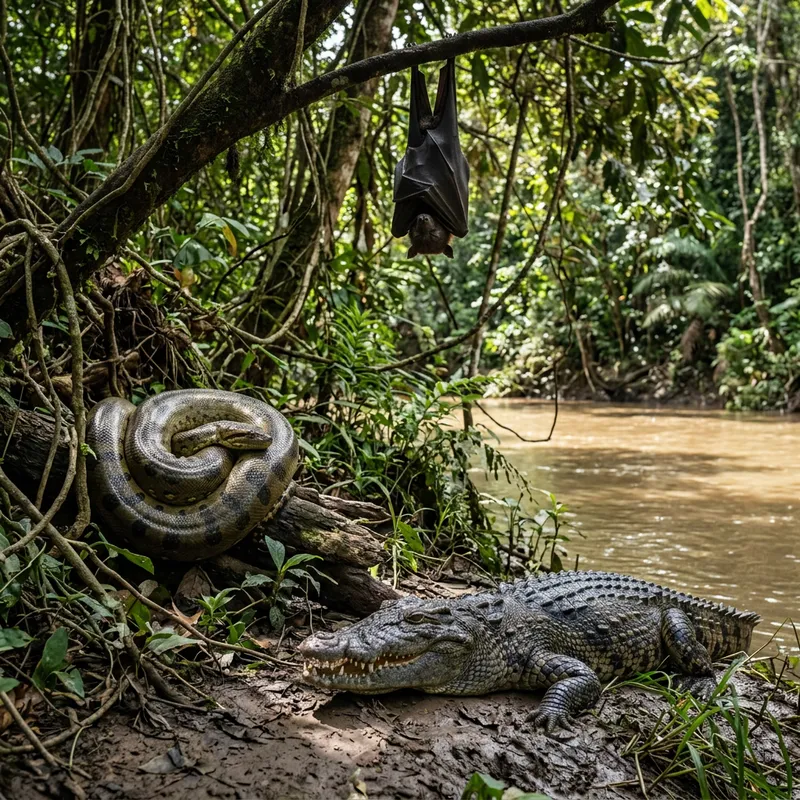 Majestic Wildlife Trio: Crocodile, Anaconda, and Bat