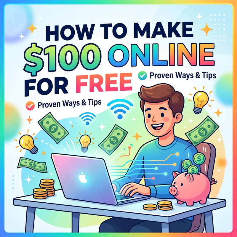 Visual representation of a blog post thumbnail related to the topic 'How to make 100 dollars online for free'. The image should ideally include digital elements like Wi-Fi symbols or a laptop, and money-related items such as dollar bills or a piggy bank. The phrase 'How to make 100 dollars online for free' should be prominently displayed in an impactful, easy-to-read font.