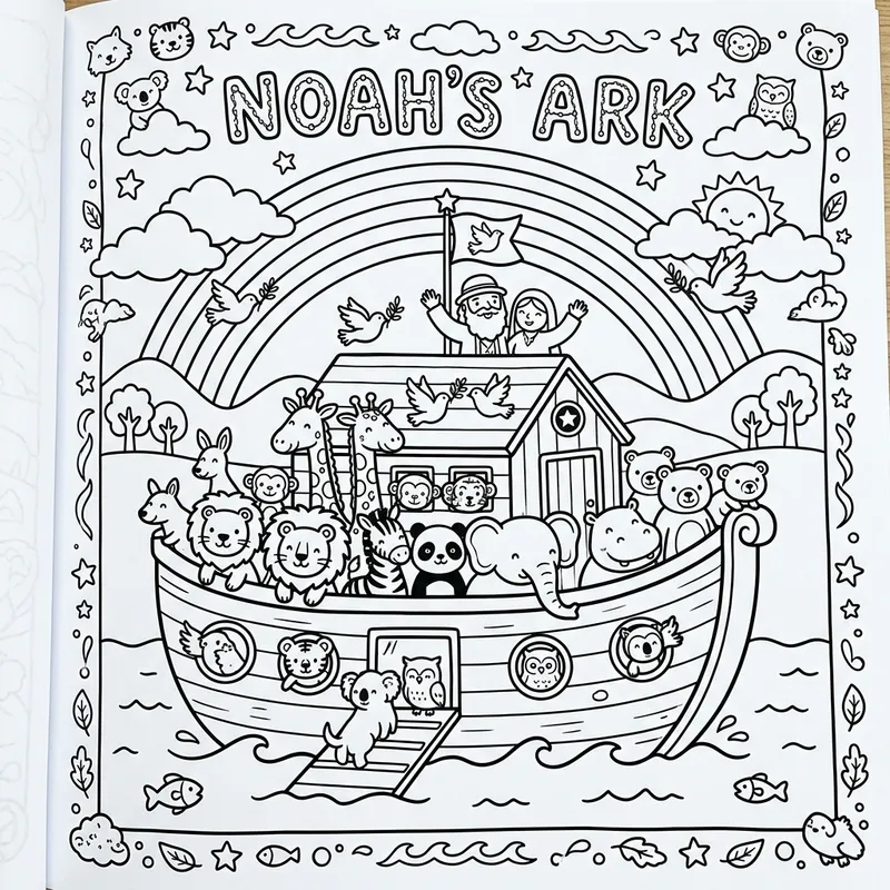 Make a bobbie goods styled coloring book page about Noah's Ark.