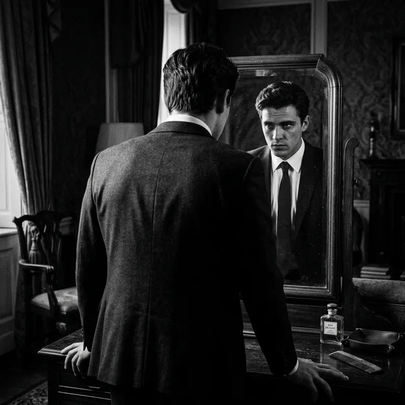 Make a dramatic black and white photo showing of a young man. The man was standing in front of the mirror, wearing a dark formal suit and a white shirt. The man faced the mirror, while the camera captured him from behind, highlighting his back and the reflection of his serious face in the mirror. The tubu pose is slightly hunched over and the man's hands touch the table, giving an elegant and confident impression. Lighting focuses on the face and the front of the body through mirror reflections, with intense shadows surrounding the right and left sides, creating a mysterious and artistic atmosphere. The background of the room looks like a hotel room or an exclusive dressing room, with a small table and a perfume bottle at the bottom of the picture. Classic visual style, high contrast, full of dramatic nuances and cinematic aesthetics. Ratio 9:16.