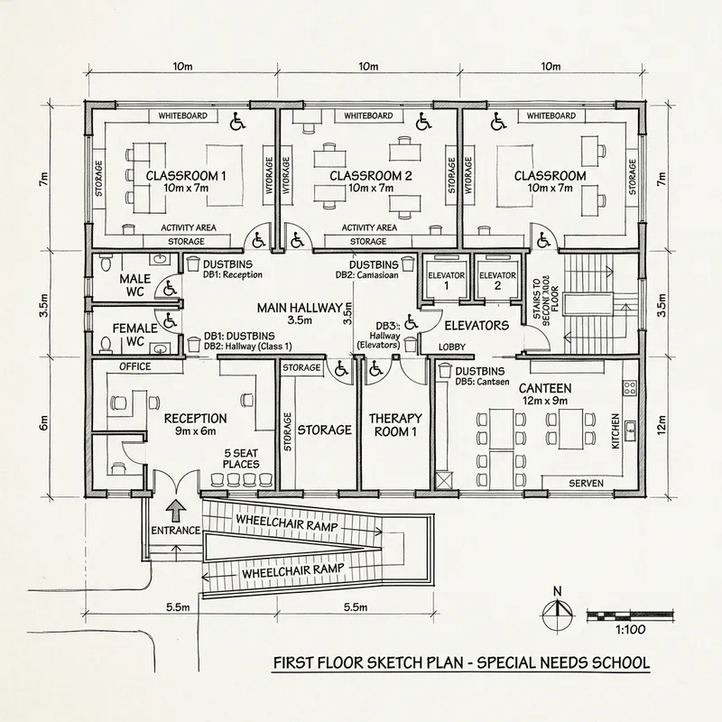 Make a special needs school sketch image first floor with these information: It must have 2 classrooms, 5 dustbins, a hallway, 2 elevators, a wheelchair ramp, a reception, 5 seat places, a canteen.