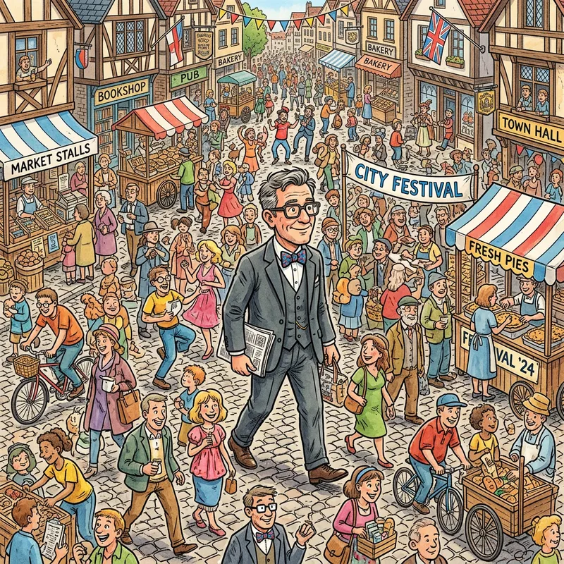 Make an animated character in the style of where’s Waldo that is a middle aged man wearing a suit and bow tie and square glasses.