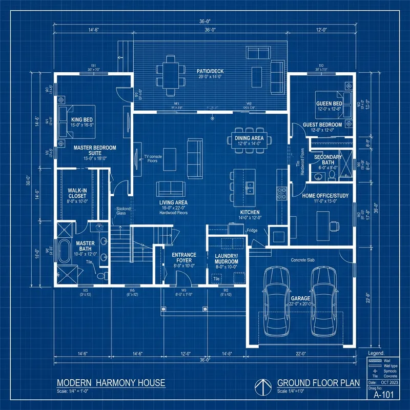 A detailed architectural blueprint of a modern house layout, showcasing the floor design, rooms division, furniture placement, and measurements. It's drawn in white lines over a blue background with notations and measurements in a clear, precise manner.