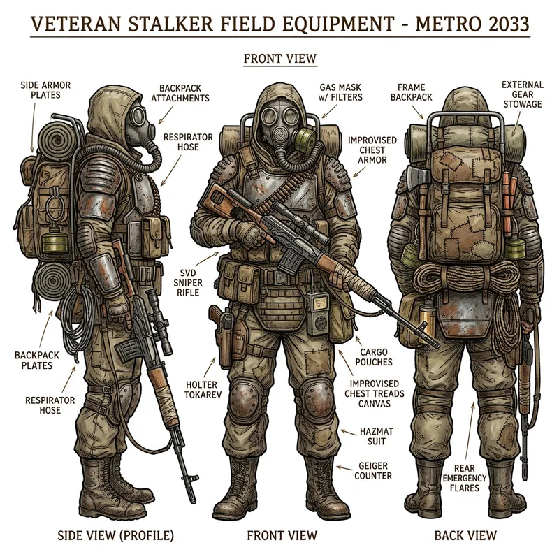 Make me a concept art of a character in equipment from the post-apocalypse Metro 2033 universe in the style of old illustrations on a white background, the back, front and side of the character, equipment at your discretion, the character should look like a survivalist in the most difficult post-apocalyptic conditions, with a gas mask, chemical protection, armor, a SVD sniper rifle in his hands, and other equipment of a veteran stalker.