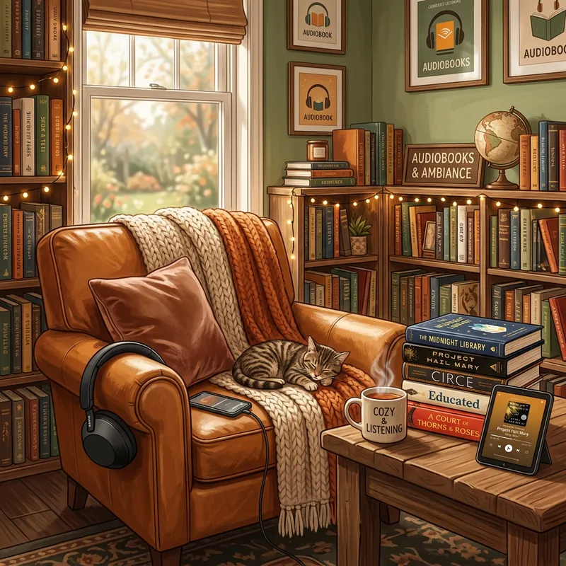 Audiobooks, modern digital artwork, a cozy reading nook with headphones and a stack of audiobooks, warm and inviting colors, professional lighting, high quality, detailed.