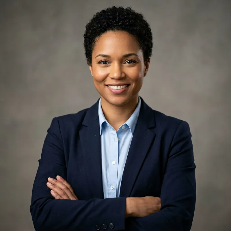 Make sure to preserve 100% of my facial features - including face without altering them in any way. half-body ID photo with cross hand Apply studio-quality lighting and a soft, neutral background. The final image should convey confidence and approachability.