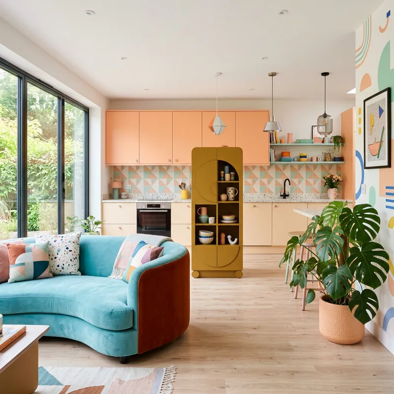 Make the kitchen interior in Memphis stilettos in delicate colors. A kitchen set in the background against the wall in the middle, a sofa in the foreground. Turquoise sofa with dark orange color, delicate orange facade of the kitchen cabinets of the upper and peach lower cabinets, dark muted yellow cabinet, white ceiling, and light laminate flooring, large panoramic windows from ceiling to floor, you can add a floor-mounted monstera flower to the sofa.